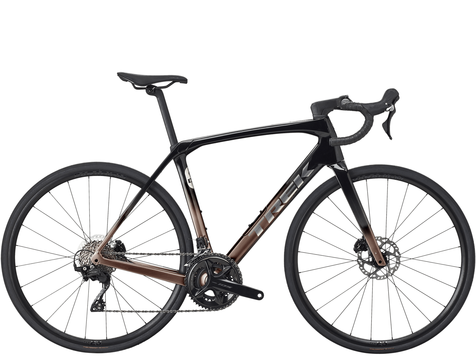 Napęd Shimano 105 R7100 2x12 gwarantuje precyzyjną i płynną zmianę biegów, a tarczowe hamulce hydrauliczne zapewniają mocne i pewne hamowanie niezależnie od pogody. Dzięki aluminiowym kołom Bontrager Paradigm 23 Tubeless Ready i prześwitowi na opony do 38 mm Domane SL 5 świetnie radzi sobie także na trudniejszych nawierzchniach.